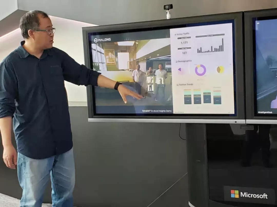 微軟的多場景應用展示,如人臉識別表情判斷是否疲勞駕駛,人臉識別輔助店鋪統計訪客數、性別等數據。